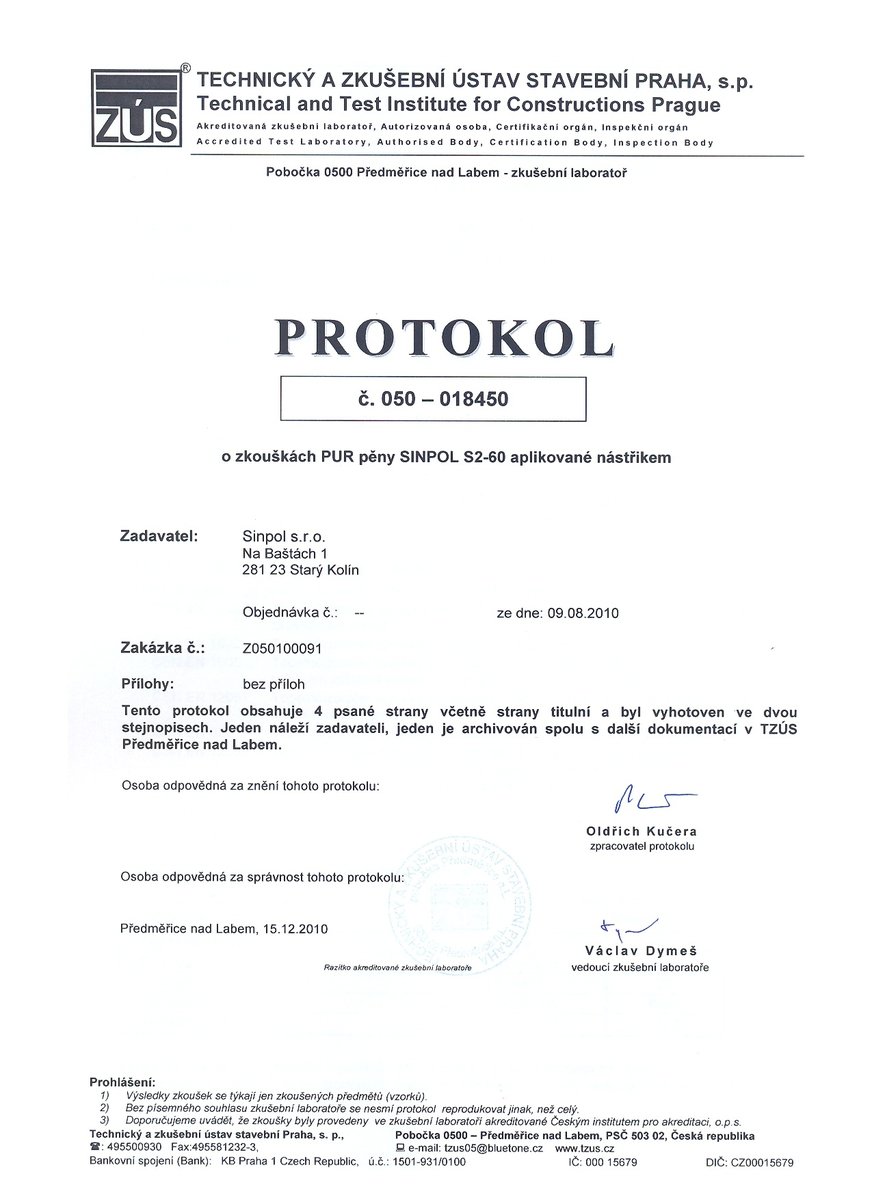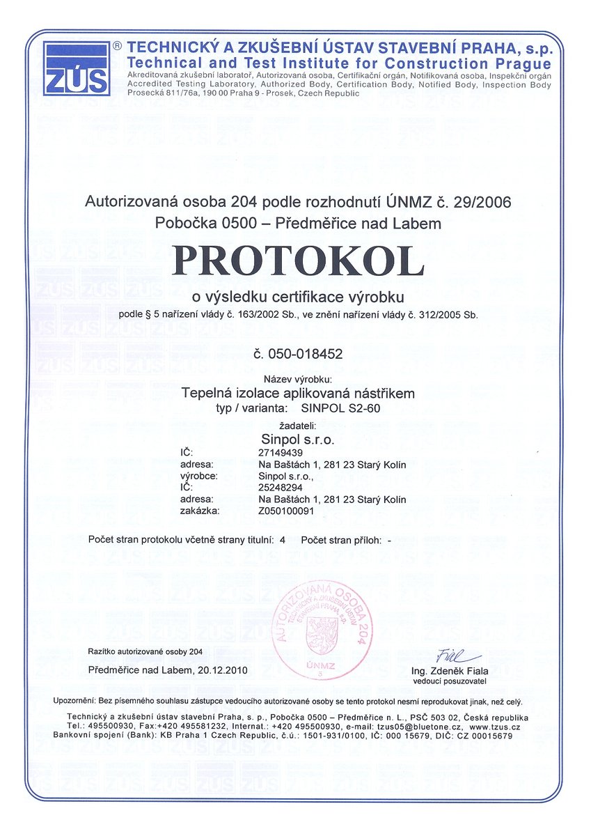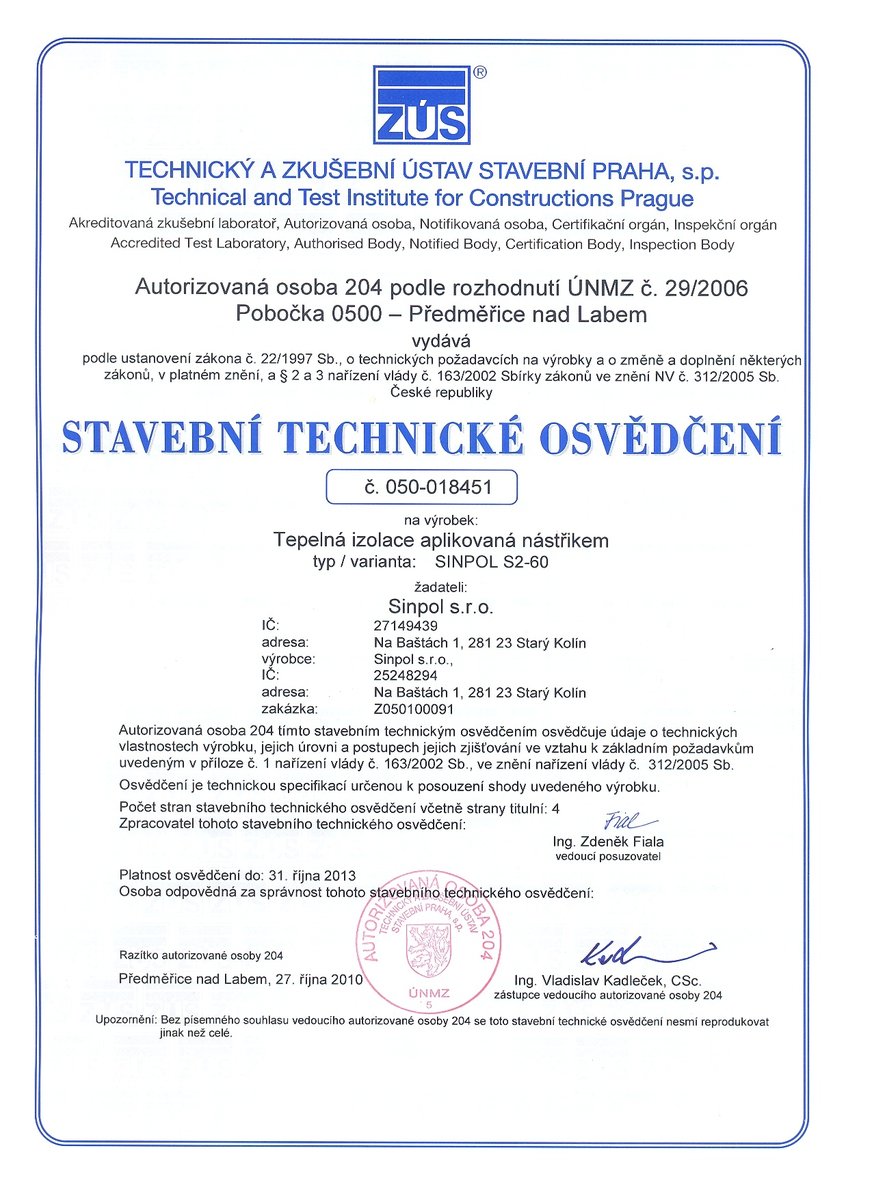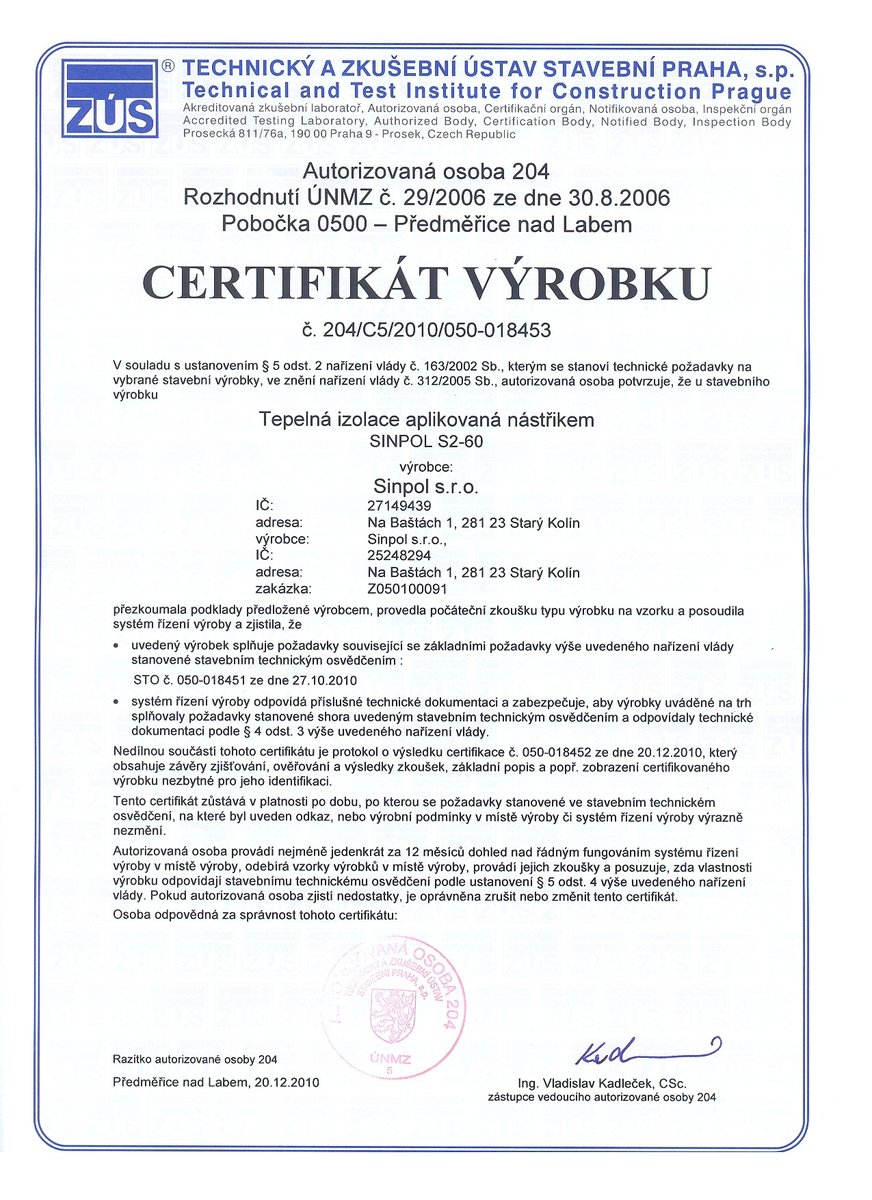 SINPOL S2-60 je systém polyuretanové pěny určený pro stříkané aplikace pro externí tepelné a vodě odolné izolace zejména střech a stěn. Po aplikaci vzniká hladký povrch, který při dobré hodnotě tepelného odporu usnadní provedení konečného UV ochranného nátěru bez zbytečných ztrát materiálu.